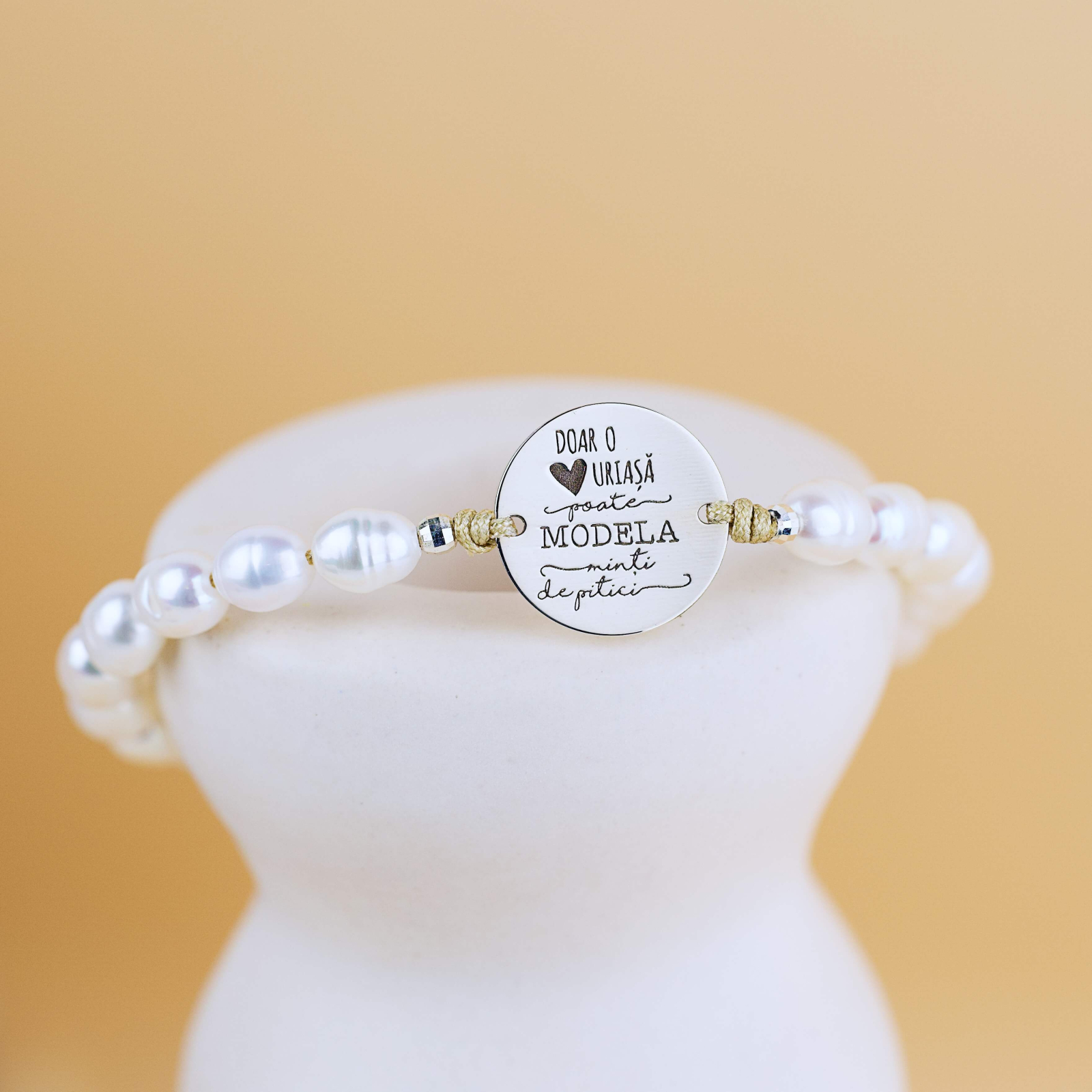Bratara Cadou Educatoare cu perle de cultura si banut din Argint personalizat este o bijuterie delicata, creata special pentru a transmite apreciere si multumire unei persoane dedicate educatiei.