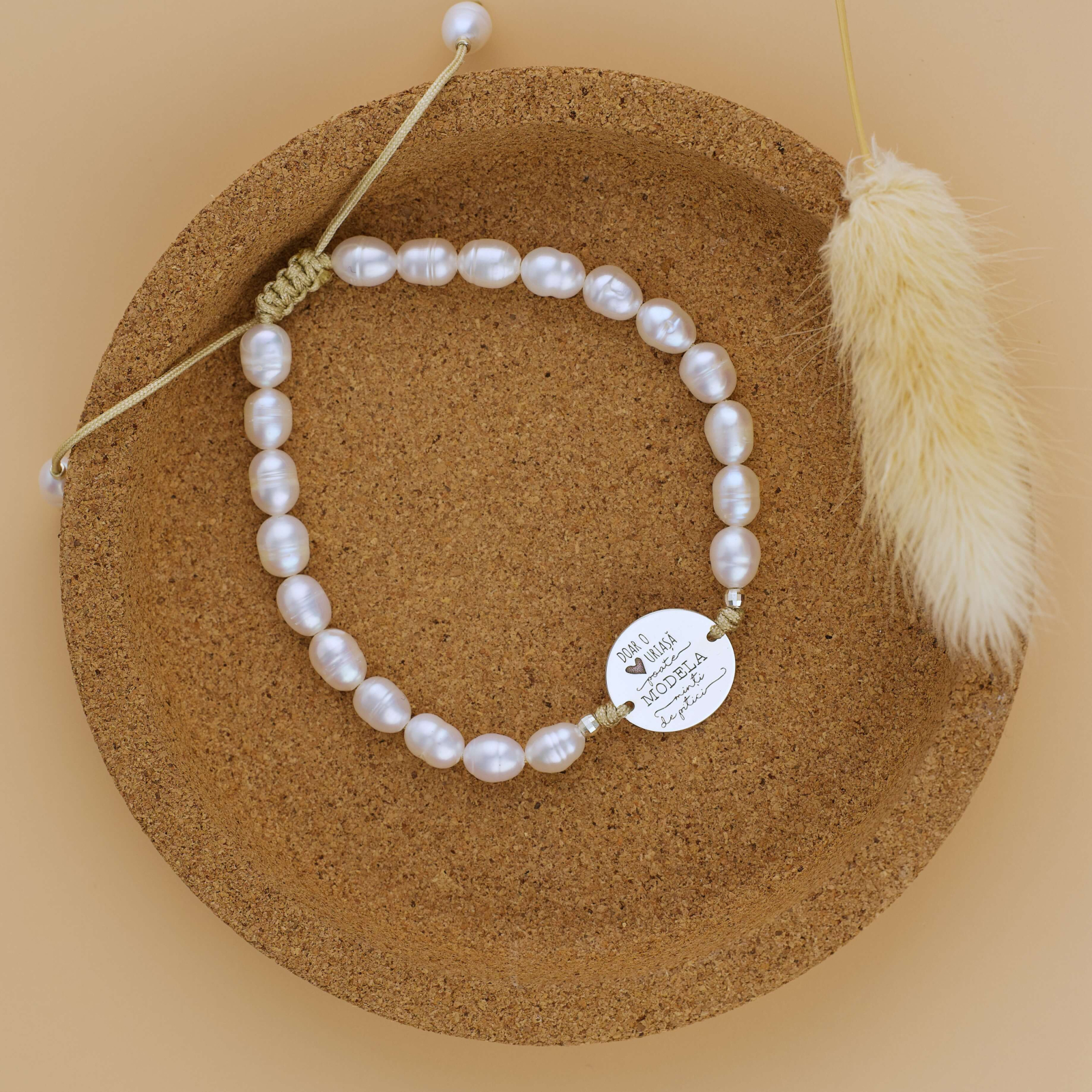 Realizata din perle de cultura, simbol al rafinamentului si puritatii, bratara impresioneaza prin eleganta si simplitate. Elementul central este un banut din Argint, gravat cu mesajul: