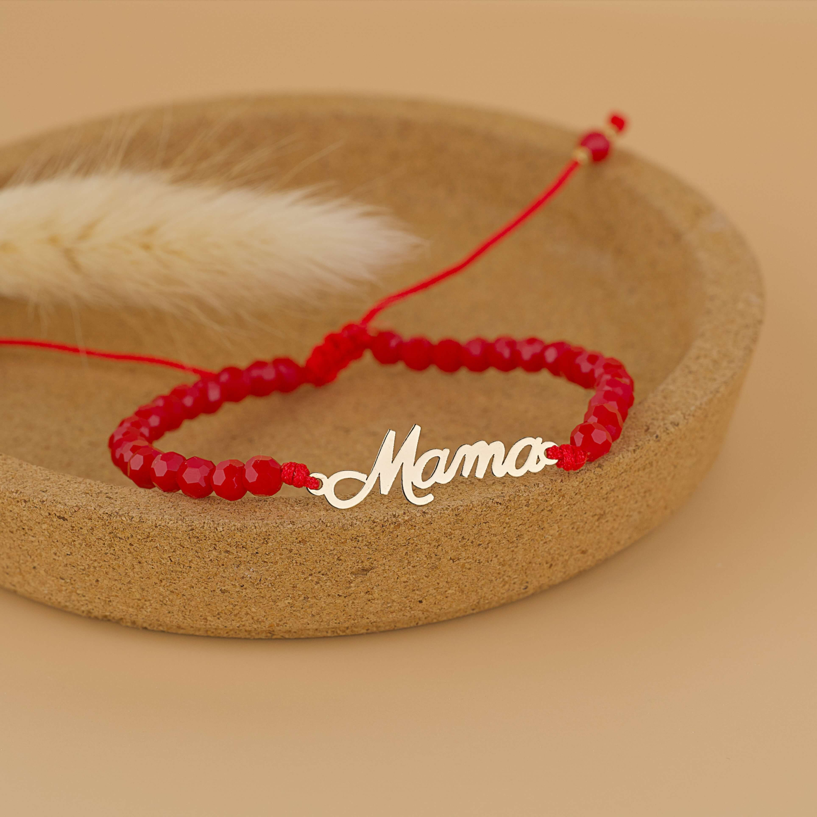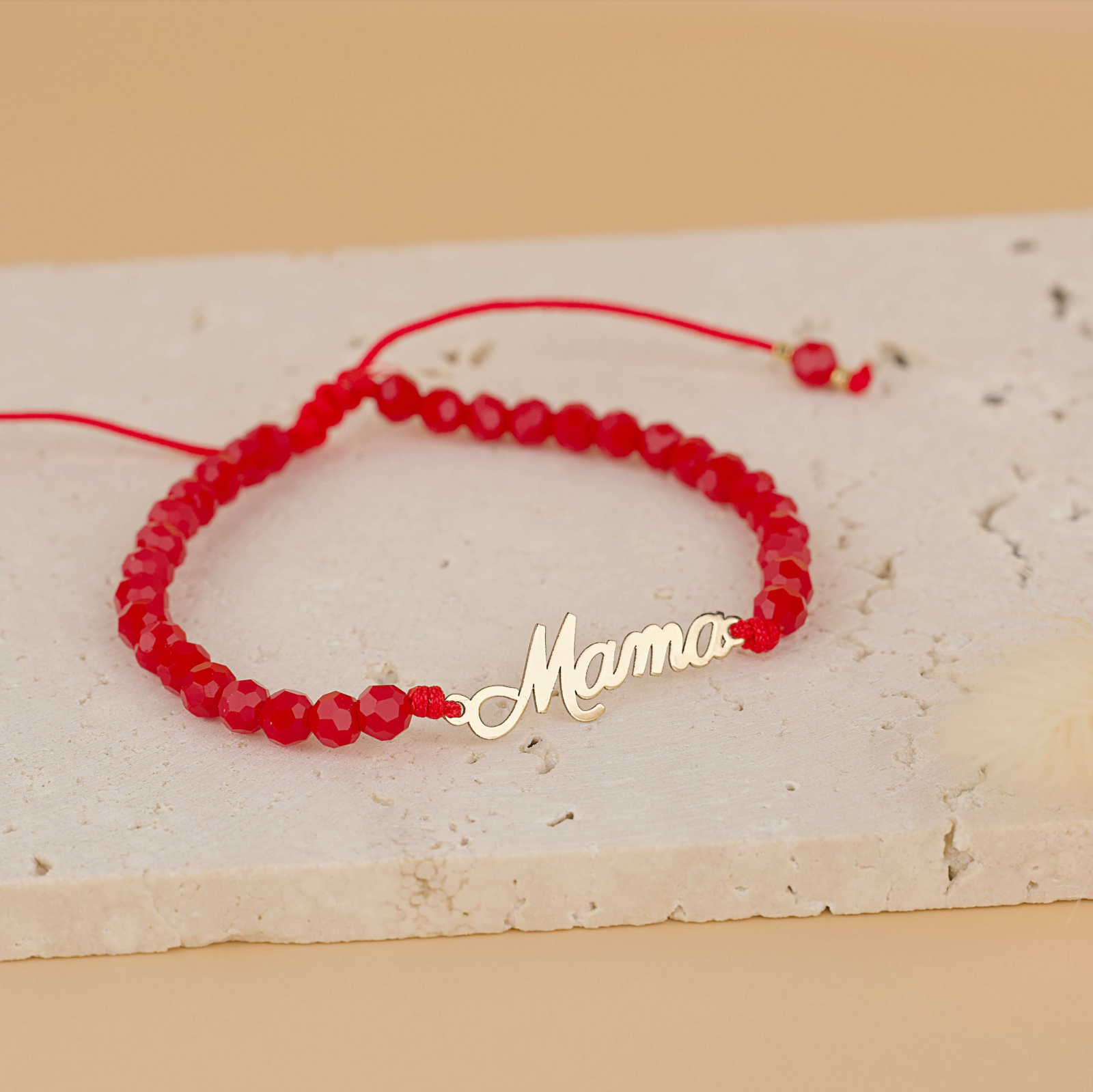 Elementul central al bratarii este un link fin din Aur 14K, inscriptionat cu cuvantul “Mama”, simbol al iubirii neconditionate pentru cea mai importanta femeie din viata noastra, mama. Mesajul delicat este completat perfect de margelele din onyx rosu, care adauga un strop de culoare, rafinament si energie pozitiva bijuteriei.