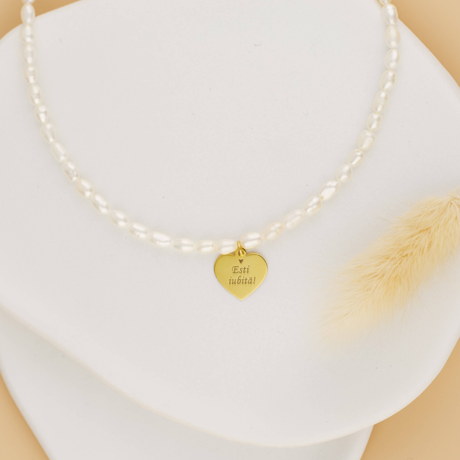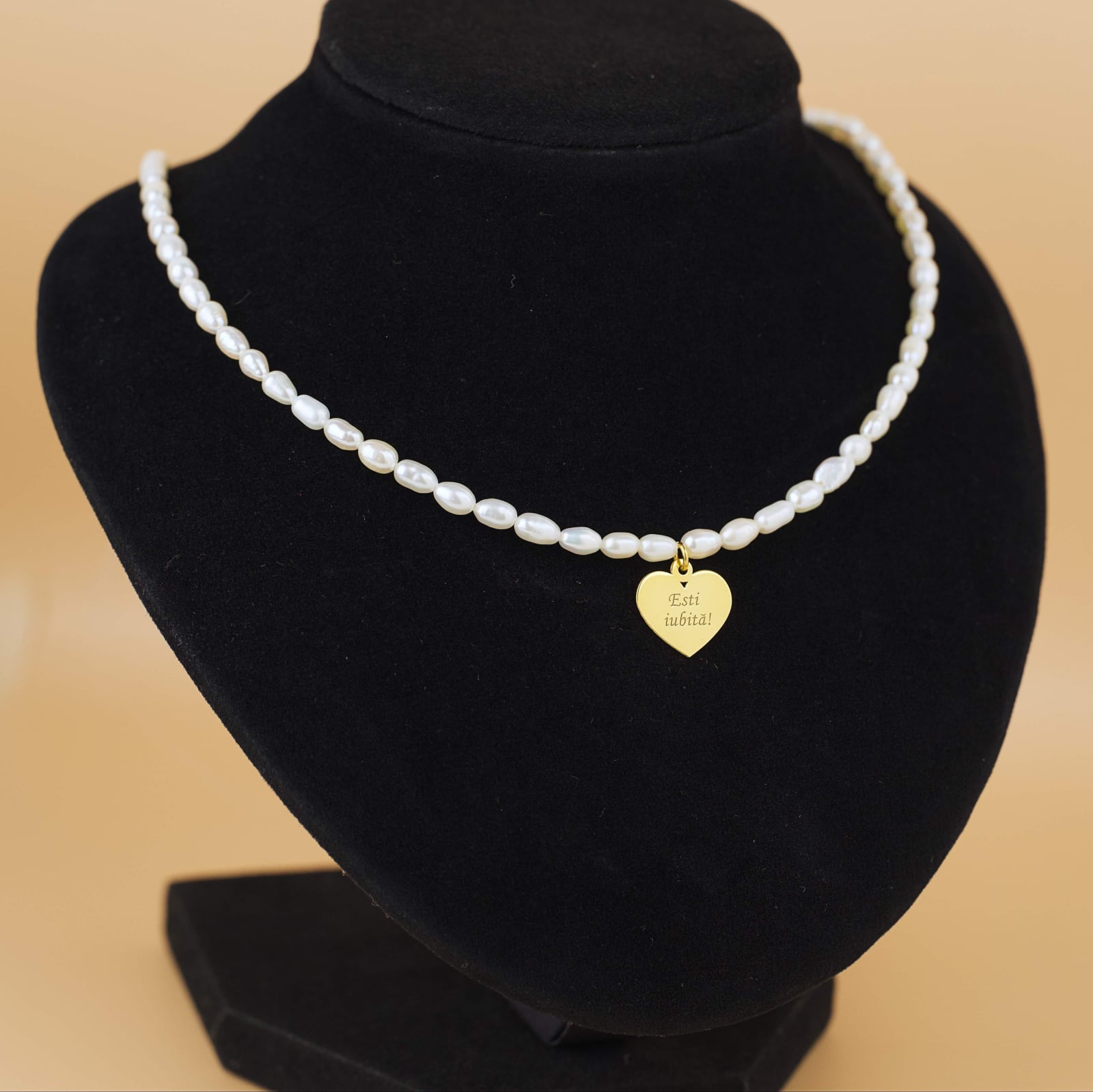 Realizat din perle de cultura, simbol al elegantei si puritatii, colierul este completat de un pandantiv in forma de inima, cu diametrul de 15 mm, gravat cu mesajul: