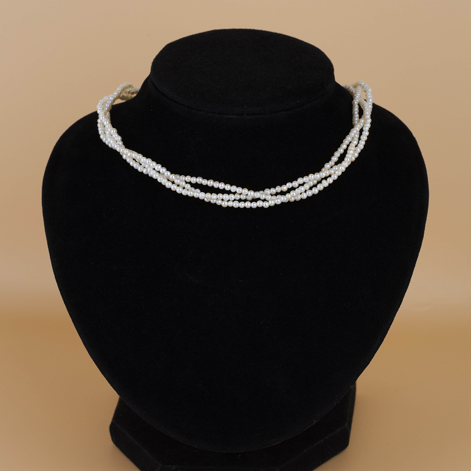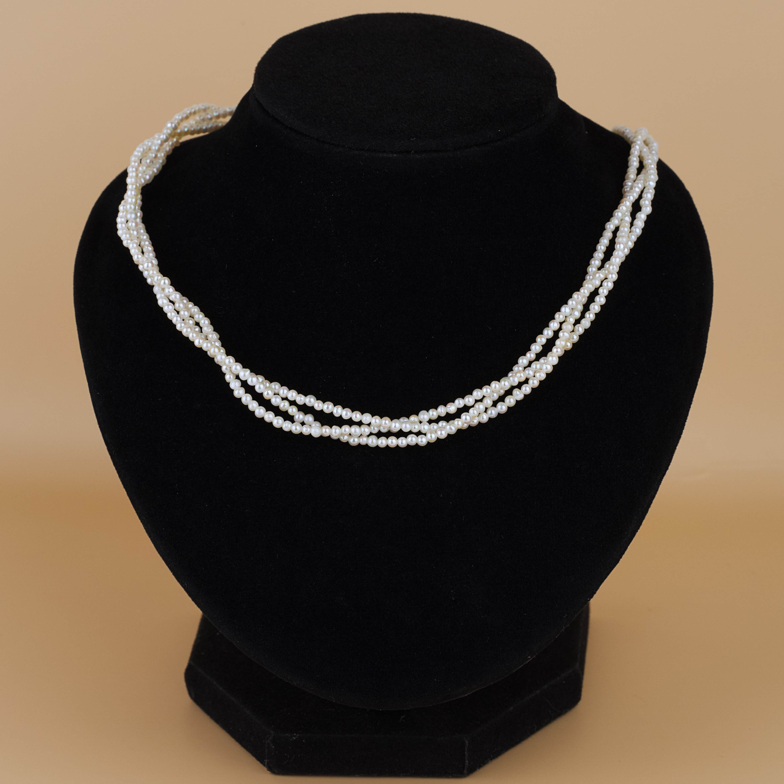 Fiecare perla este atent selectionata pentru a pastra uniformitatea formei si a luciului, oferind colierului un aspect premium, echilibrat si extrem de feminin. Dimensiunea delicata de 3–4 mm accentueaza finetea designului, in timp ce impletirea celor trei siraguri creeaza volum si dinamica subtila.