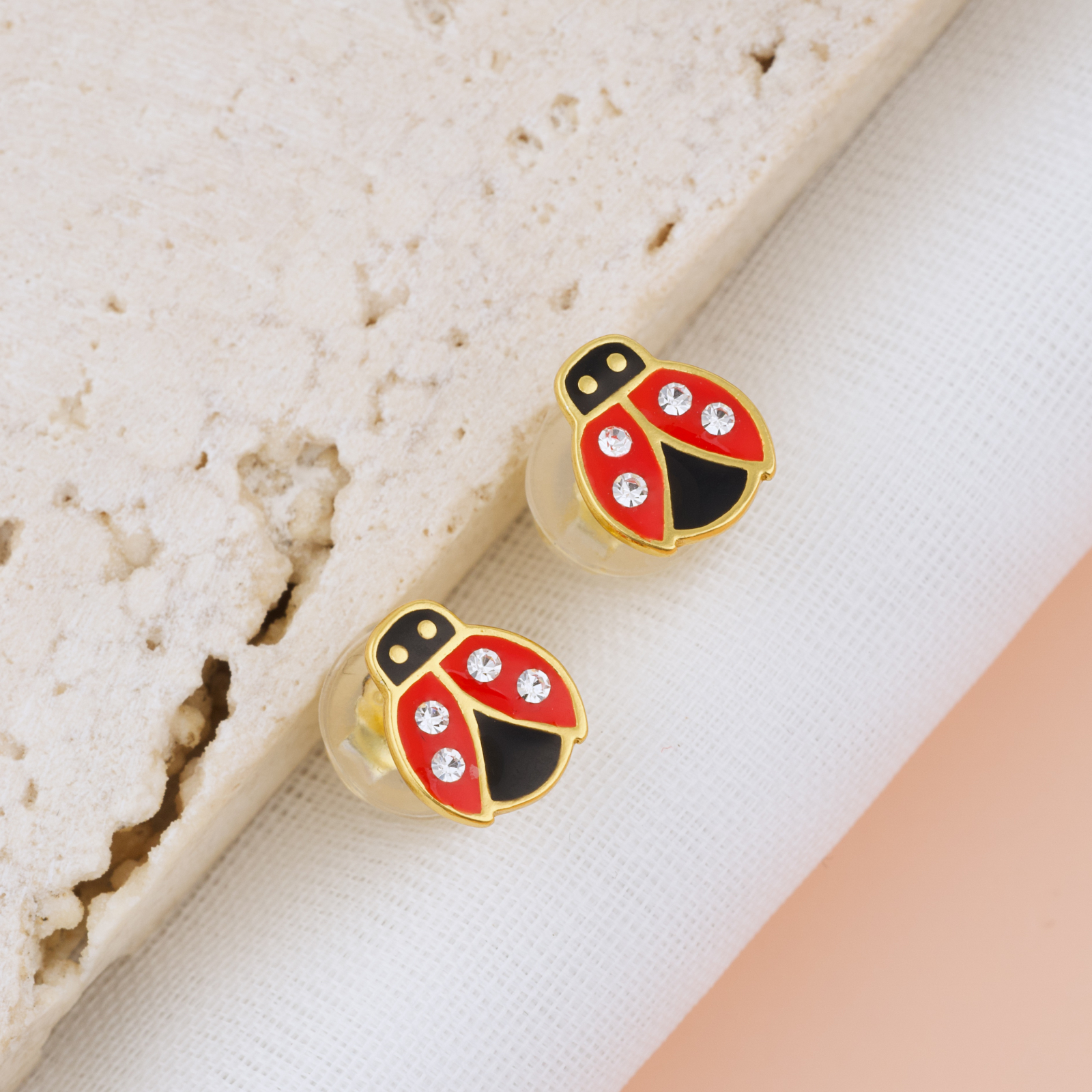 Micuta si cu noroc, acum si la ureche. Cerceii Buburuz combina rosu intens, negrul precis si aurul cald intr-un design clasic si iubit de generatii intregi — cu un twist modern: cristale albe stralucitoare inlocuiesc punctele traditionale, adaugand o sclipire neasteptata si eleganta. Potriviti pentru fetite, dar la fel de draguti si pentru femeile care isi pastreaza spiritul jucaus. Realizati prin turnare din argint 925 si placati cu aur 24K, sunt durabili, bine finisati si complet siguri — inchizatoarea acoperita cu silicon moale protejeaza urechiusele celor mici toata ziua.