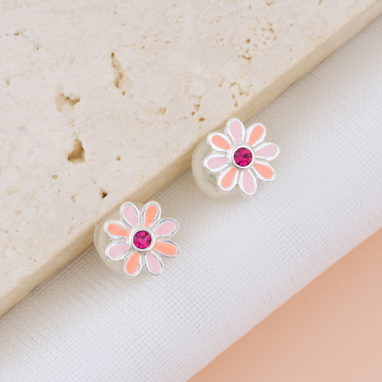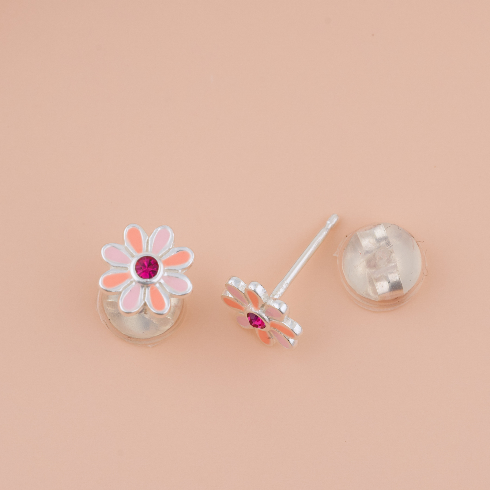 Delicati, feminini si plini de prospetime. Cerceii Floare cu Cristal combina petale in doua nuante de roz — pudra si piersica — cu un cristal fucsia vibrant in centru, care prinde lumina si atrage privirea imediat. O floare mica, dar cu o prezenta mare. Potriviti pentru fetite, dar la fel de draguti si pentru femeile care iubesc bijuteriile fine si colorate. Realizati prin turnare din argint 925 si placati cu argint 999, sunt durabili, bine finisati si complet siguri — inchizatoarea acoperita cu silicon moale protejeaza urechiusele celor mici toata ziua.