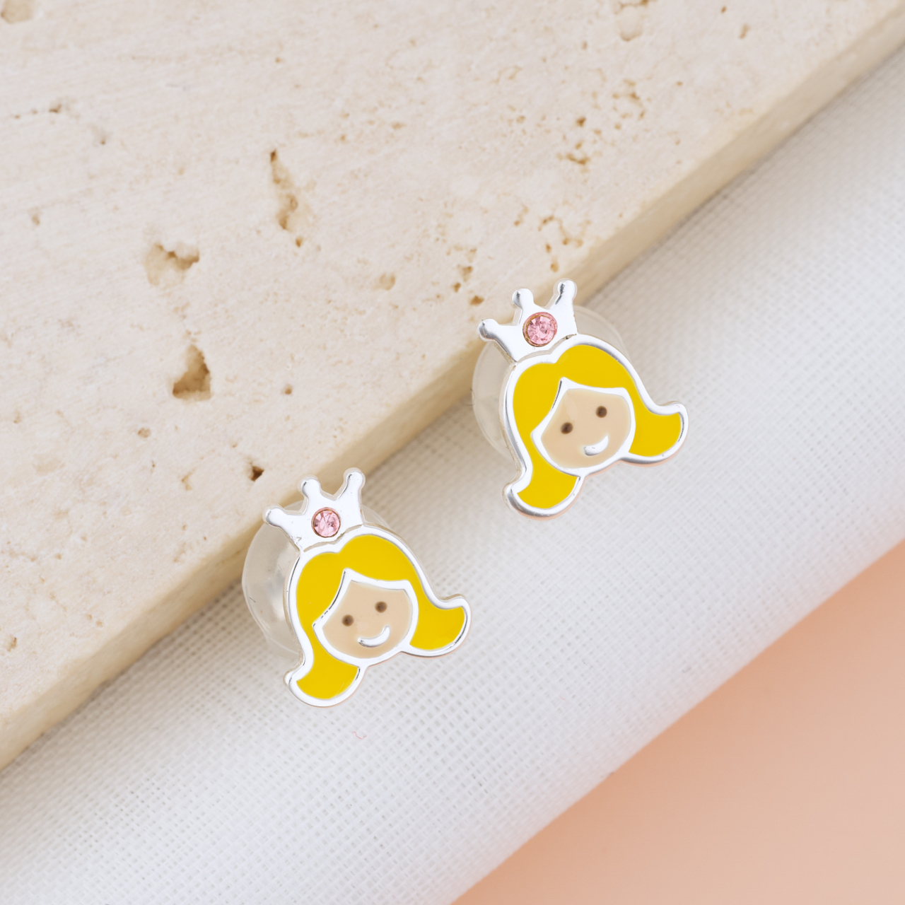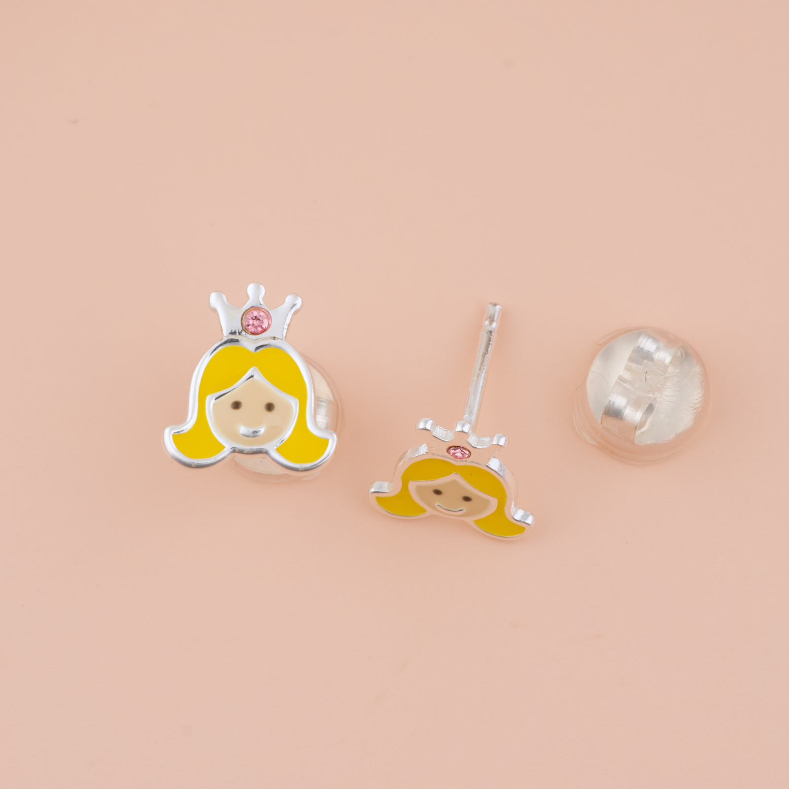 Pentru fetita care stie ca este o printesa — si acum are si cerceii care confirma asta. Cerceii Printesa infatiseaza o printesa zambareata cu par galben si coroana argintie ornata cu un cristal roz, intr-un design adorabil si plin de caldura. Un accesoriu care spune povestea ei, purtat cu mandrie zi de zi. Realizati prin turnare din argint 925 si placati cu argint 999, sunt durabili, bine finisati si complet siguri — inchizatoarea acoperita cu silicon moale protejeaza urechiusele celor mici toata ziua.