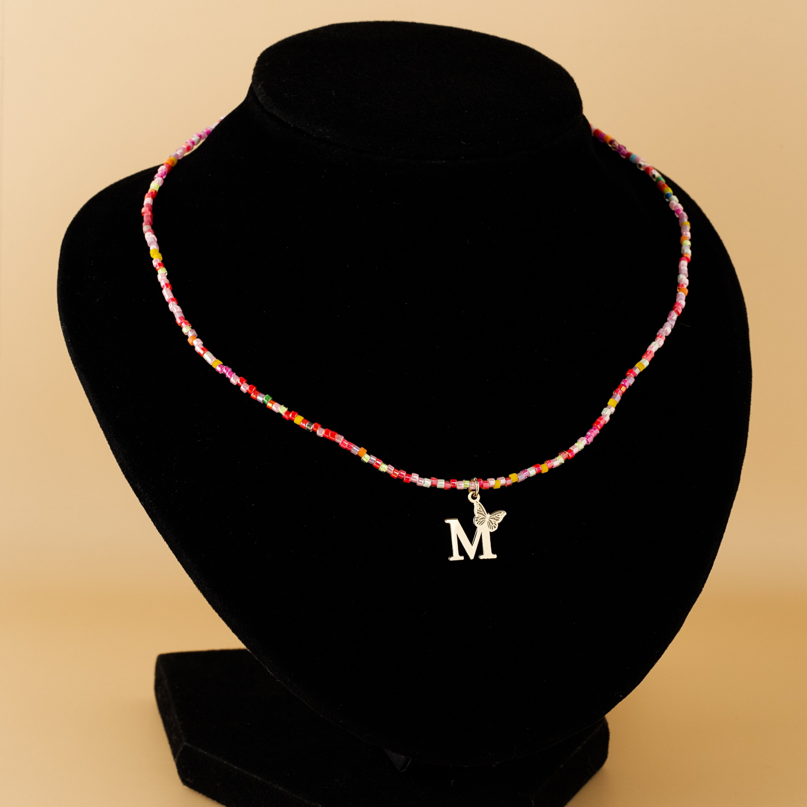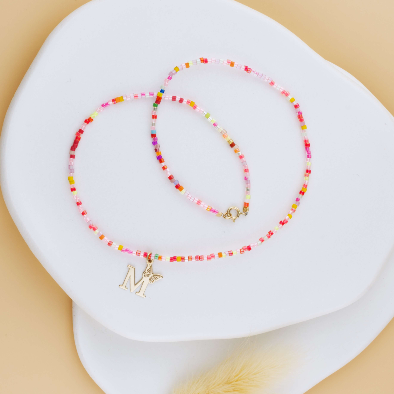 Acest colier pentru fetite cu margelute colorate si pandantiv Initiala nume cu fluturas din Aur 14K este creat pentru acele momente speciale care raman in suflet.