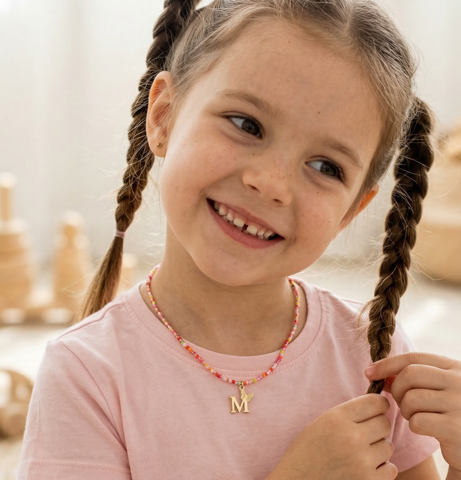 Culorile vesele ale margelutelor aduc bucuria copilariei, iar pandantivul cu initiala numelui si fluturas din Aur 14K transforma colierul intr-o bijuterie personala, unica pentru fiecare fetita. Fluturasul simbolizeaza libertatea, inocenta si magia primilor ani din viata – acele momente simple care devin, peste timp, cele mai pretioase amintiri.
