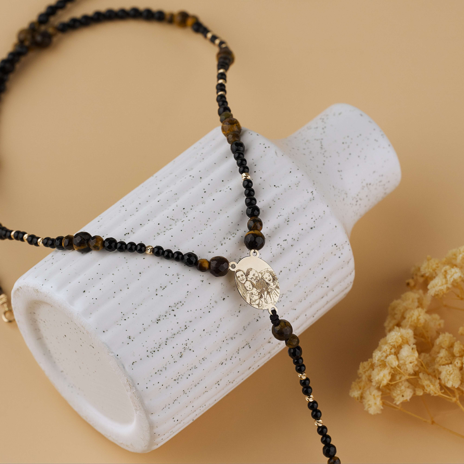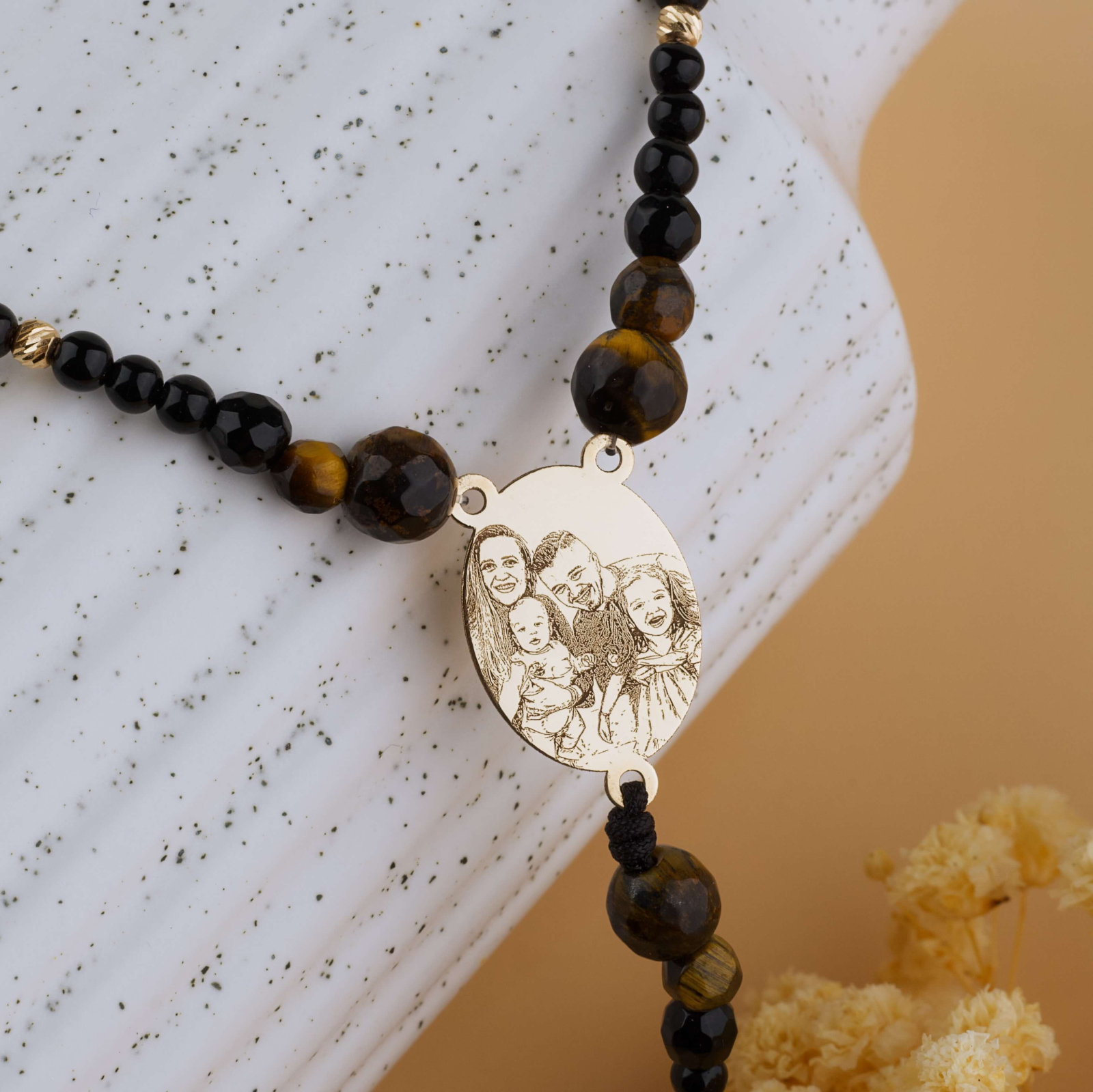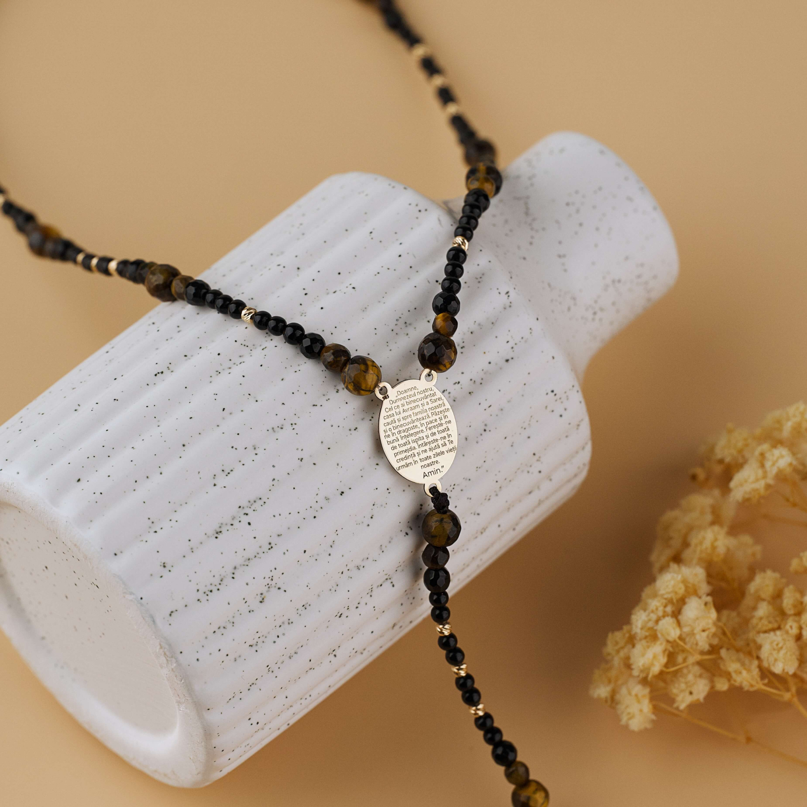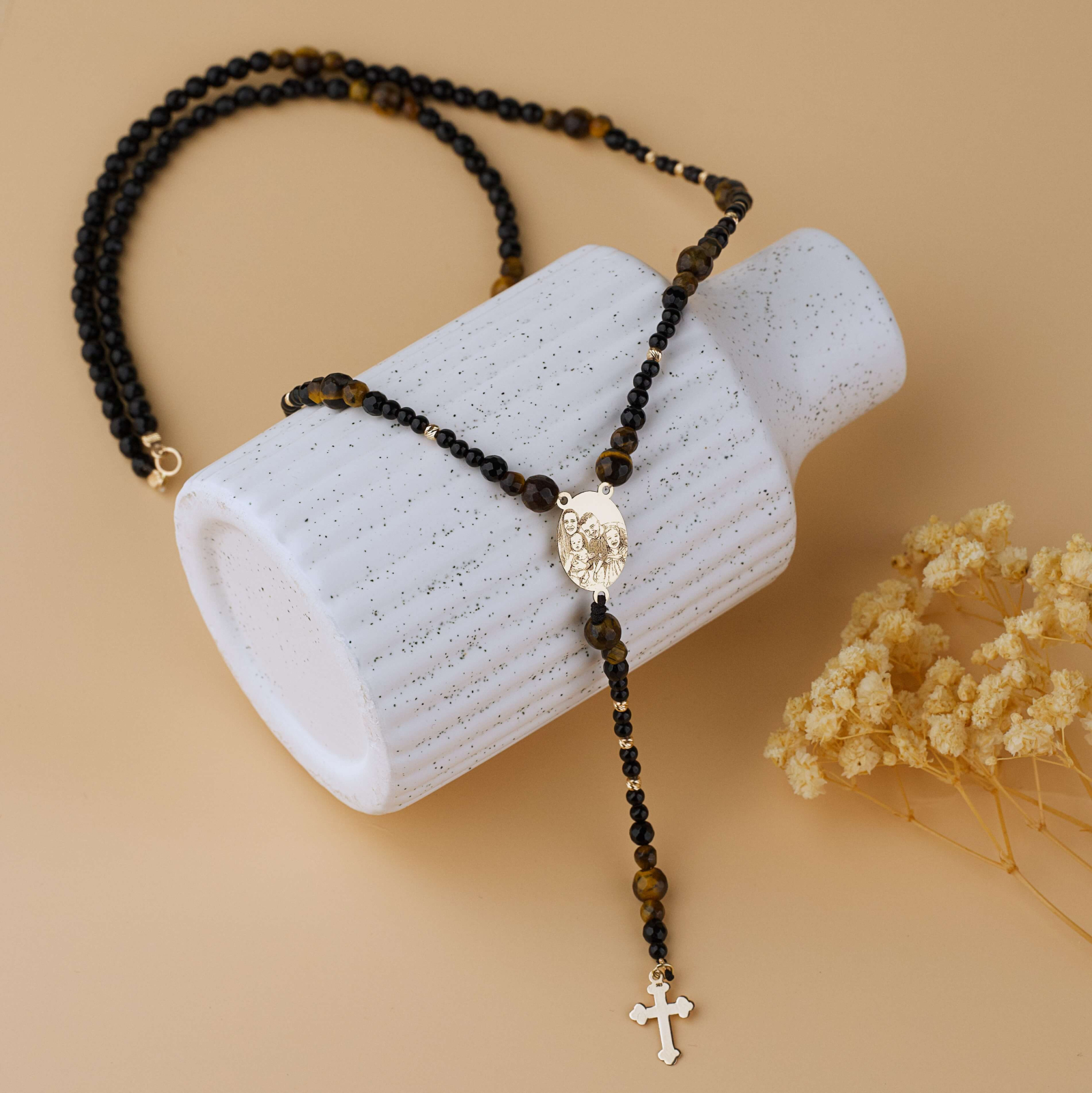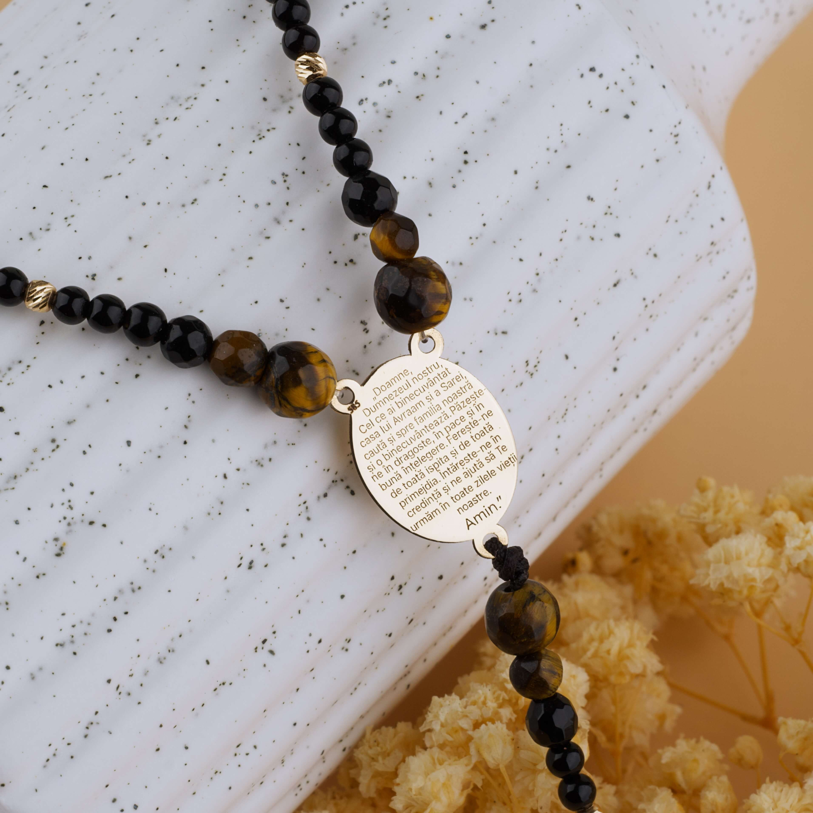 Rozariu din Aur 14K cu Fotogravura — Margele Ochi de Tigru & Onix Negru