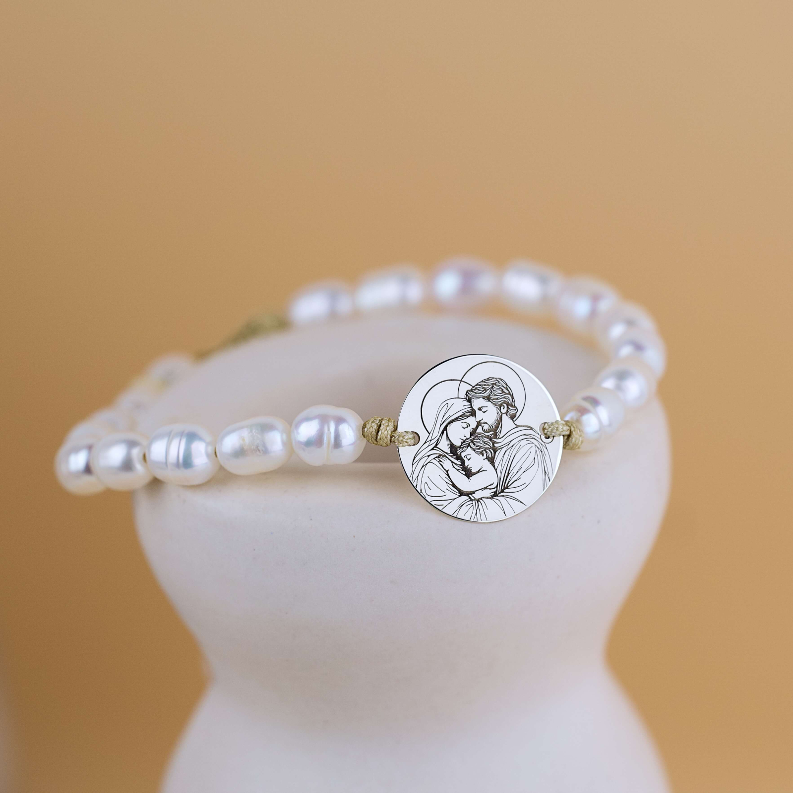 Bratara crestina cu perle de cultura si banut din Argint gravat cu Icoana Sfintei Familii este un simbol al iubirii, protectiei si unitatii.