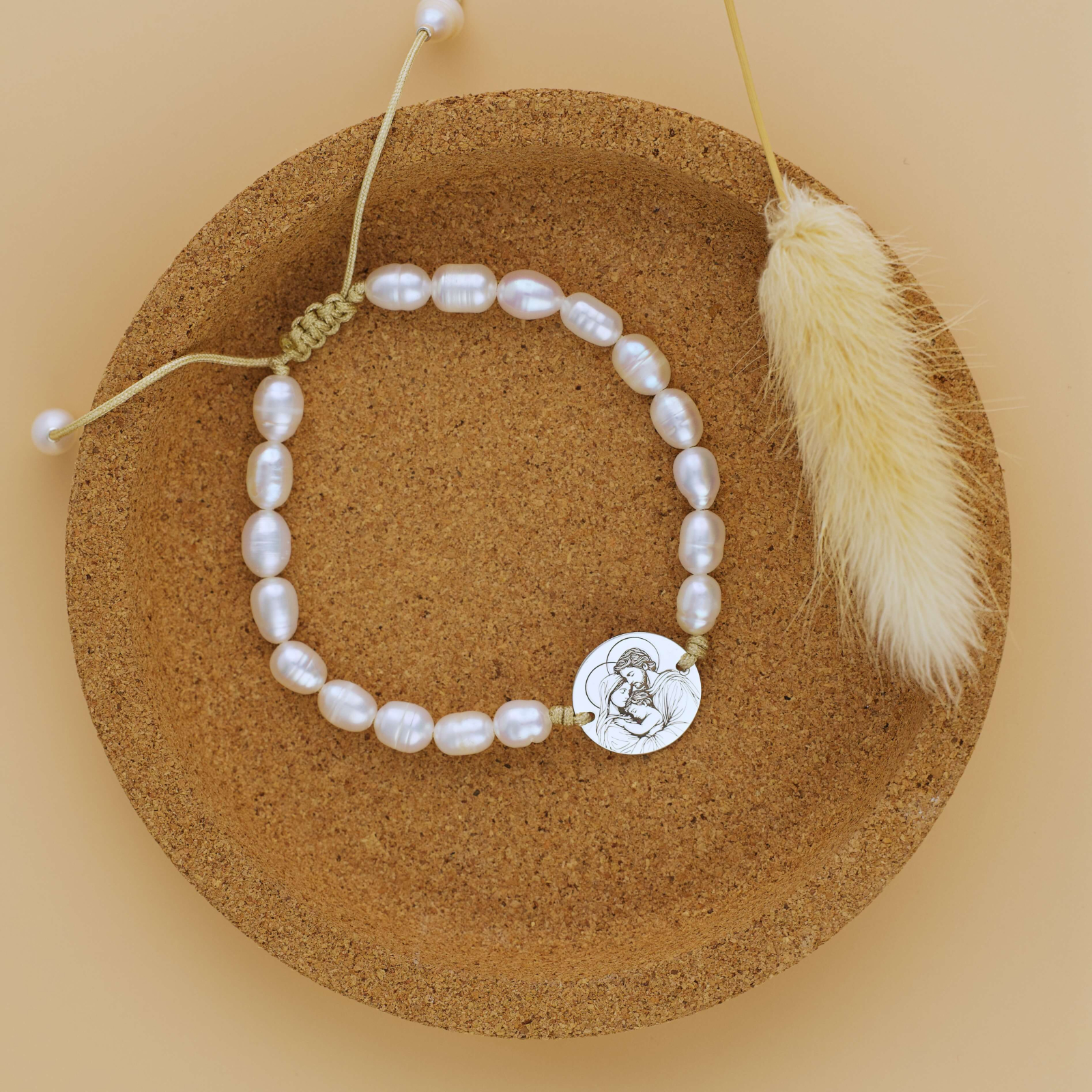 Realizata din perle de cultura, delicate si luminoase, bratara exprima puritate si eleganta clasica. Elementul central este un banut din Argint, fin gravat cu reprezentarea Sfintei Familii, simbol al armoniei, credintei si ocrotirii divine.