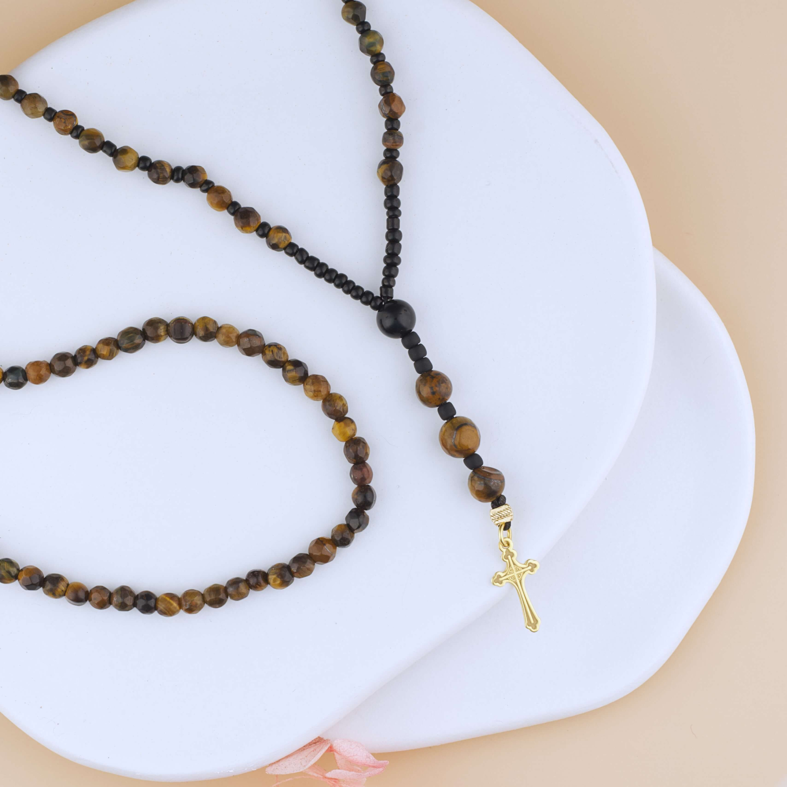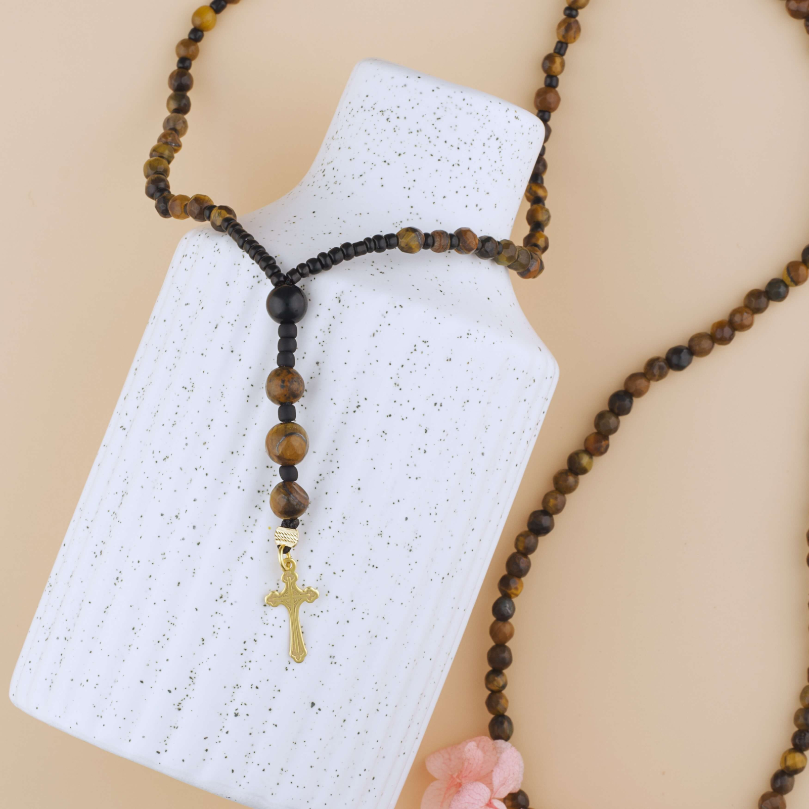 Rozariu pentru barbati realizat din margele de Ochi de Tigru si o cruce din Argint 925 placat cu aur 18K. O bijuterie cu o prezenta puternica, dar echilibrata, care imbina simbolistica spirituala cu un design masculin si modern.