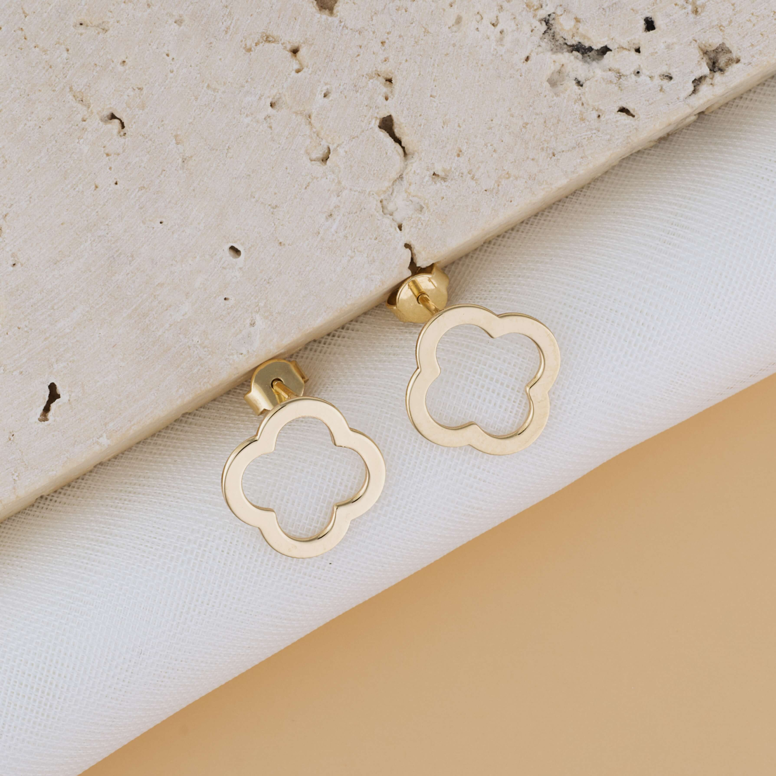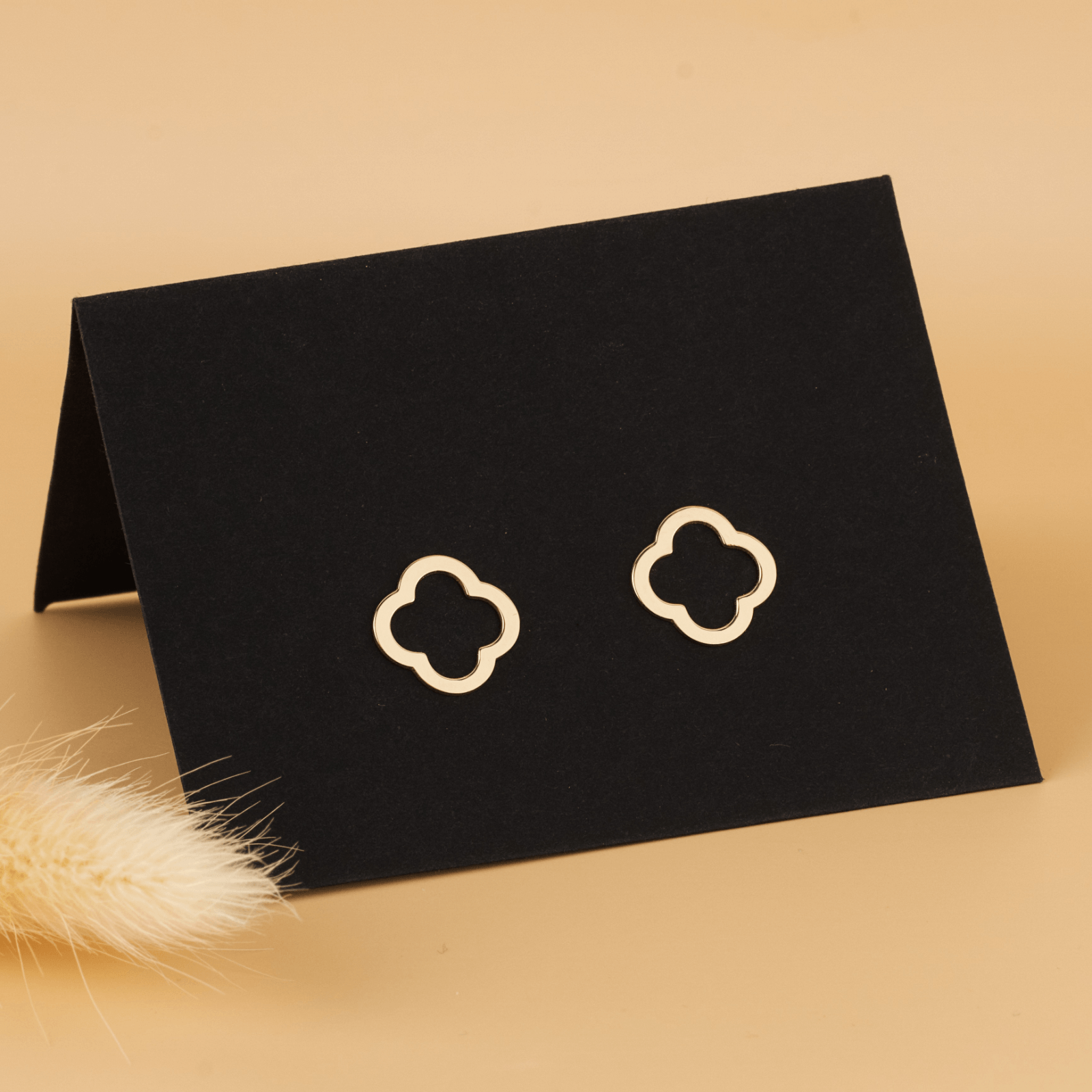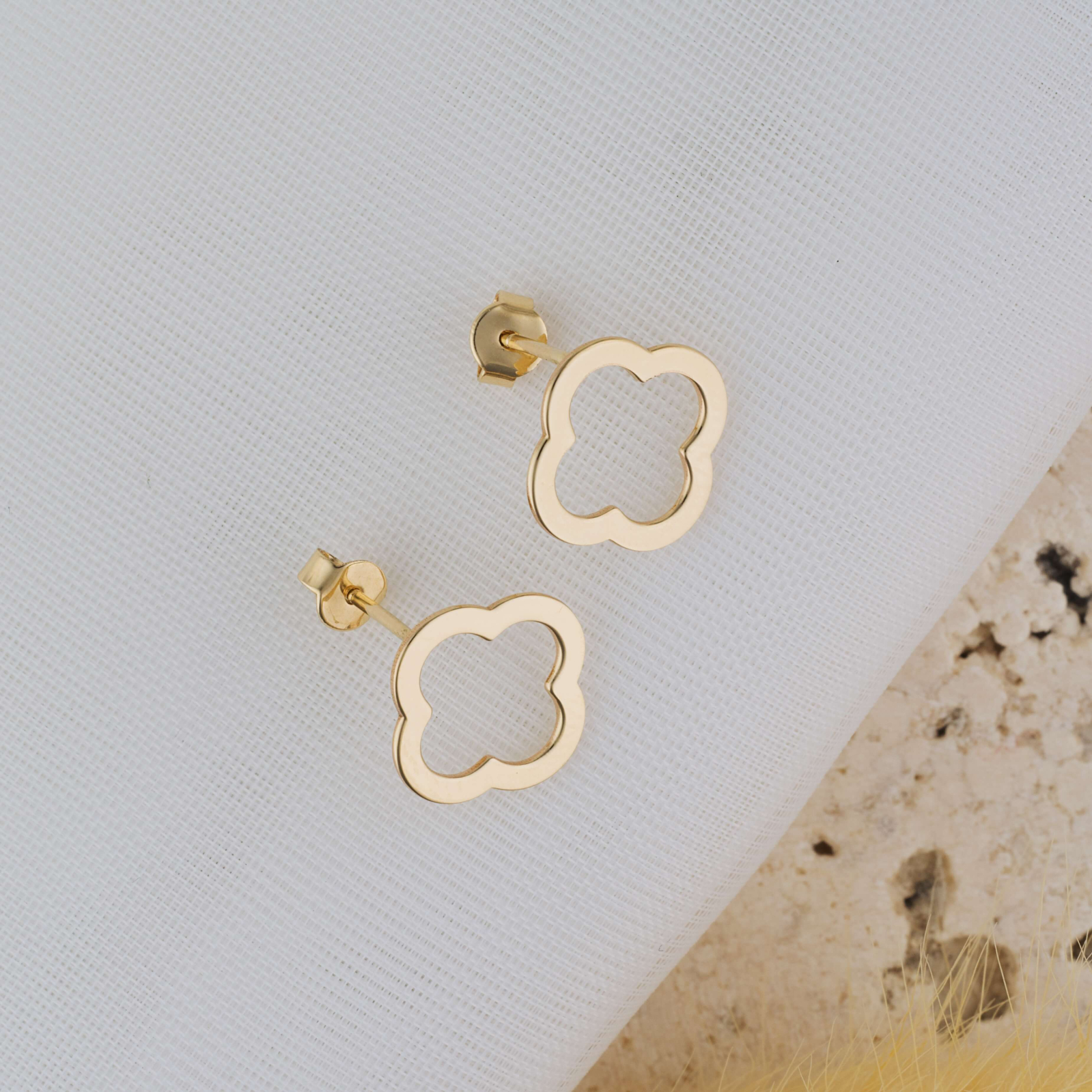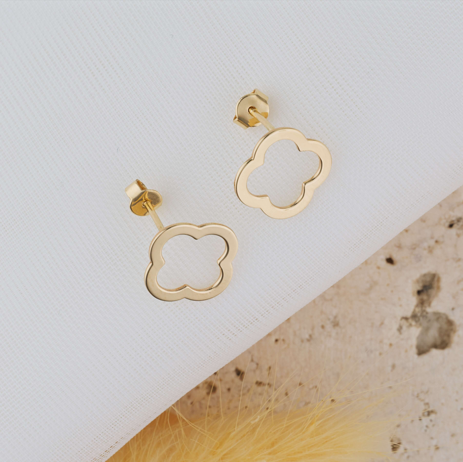 Forma Clover este taiata cu precizie — conturul aur lucios inconjoara un spatiu gol in centru, creand un joc de plin si gol care prinde lumina diferit in functie de unghiul privirii. Dimensiunea de 10 x 10 mm este calculata sa fie prezenta fara sa fie exagerata — vizibila pe lobul urechii, dar nu imposibil de purtat zilnic. Realizati in aur 14K, cerceii au o greutate placuta de aproximativ 1 gram — suficient cat sa se simta reali, destul de usori ca sa ii uiti pe ureche.