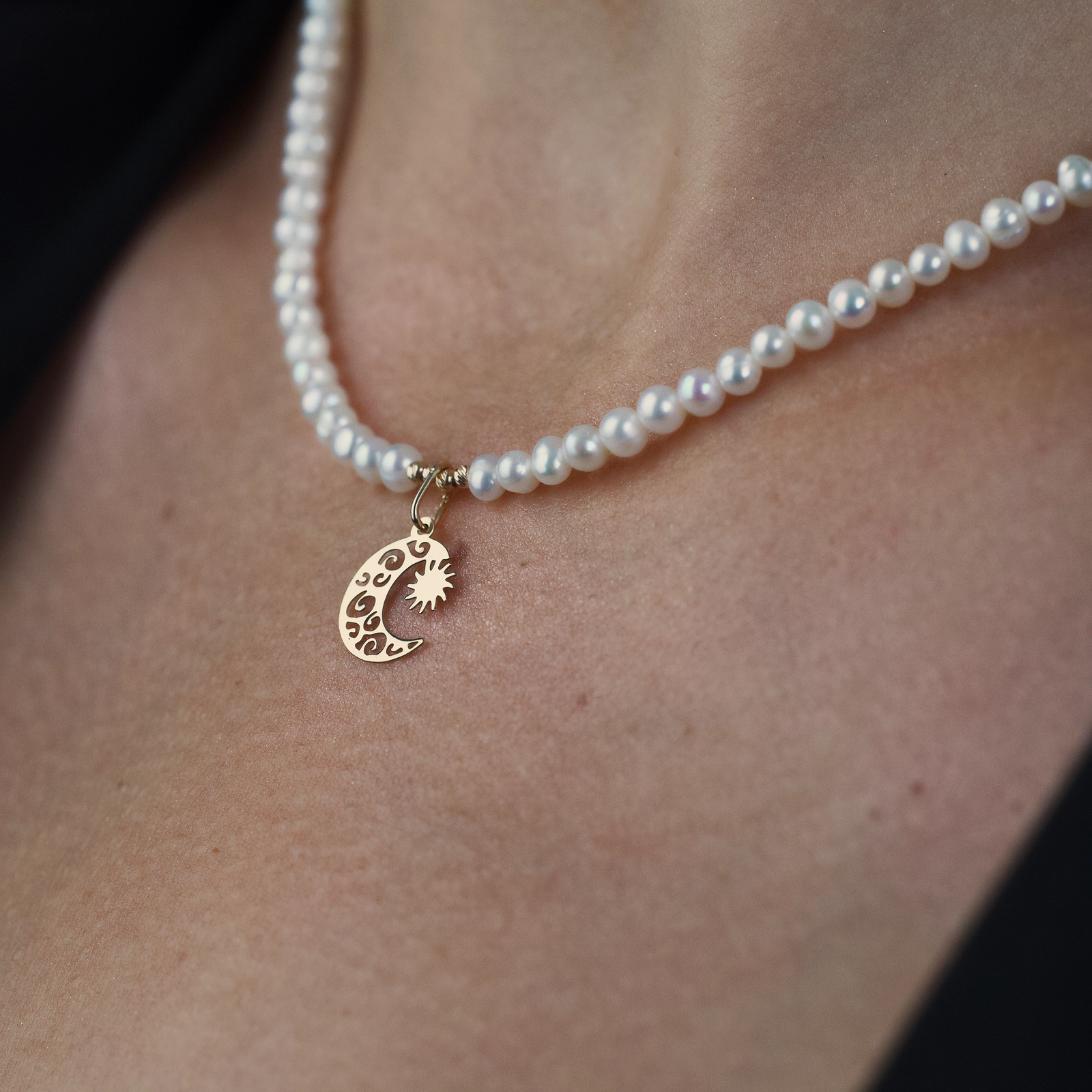 Colier elegant din perle naturale de cultura care reunește simbolurile Lunii și Soarelui într-un pandantiv din Aur 14K, suspendat pe un șir de perle naturale delicate. Cele patru bilute din aur plasate central adaugă un detaliu rafinat acestei creații.