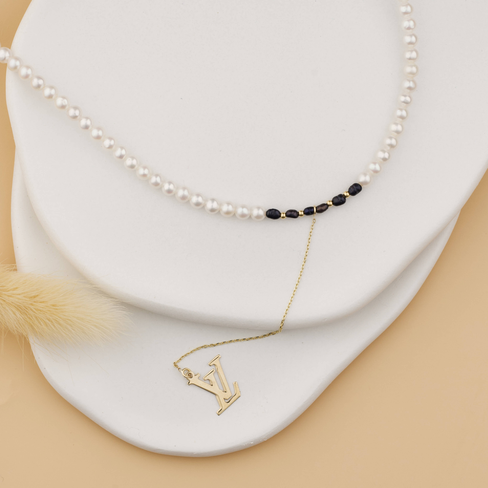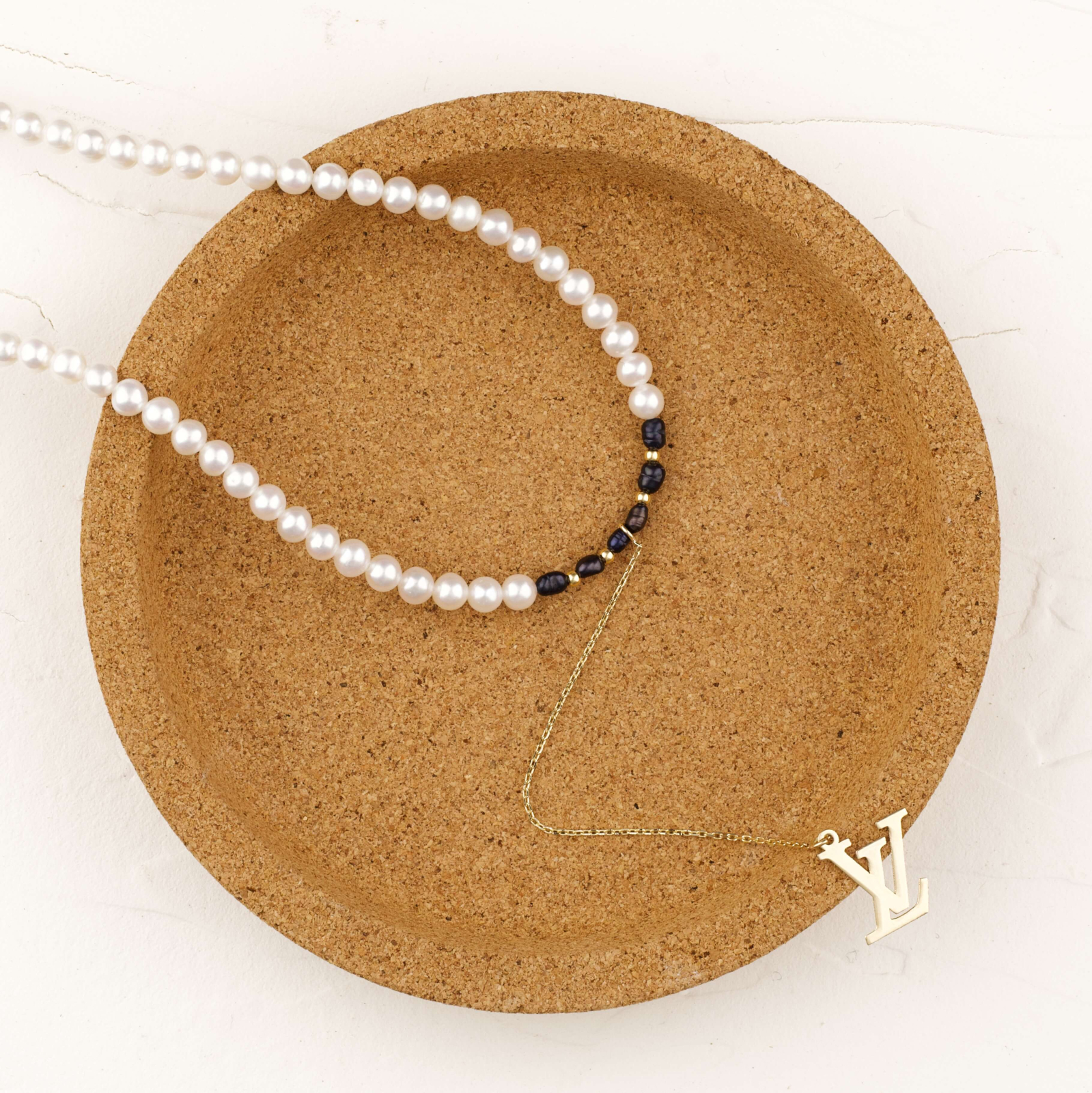 Colier realizat din perle albe naturale de cultura, cu accente de perle negre si bilute din Aur 14K, completat de un pandantiv Louis Vuitton (OEM) pe extensie fina de lantisor. Un model modern, aerisit, cu un detaliu central care face diferenta fara sa incarce.
