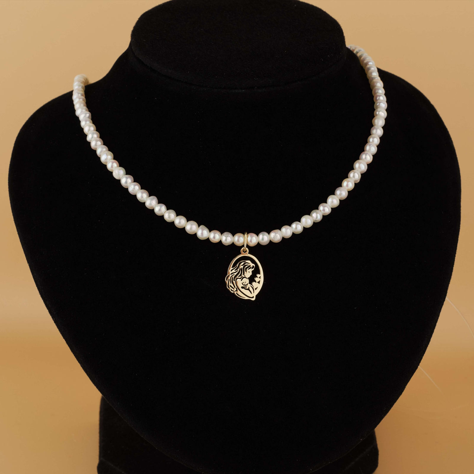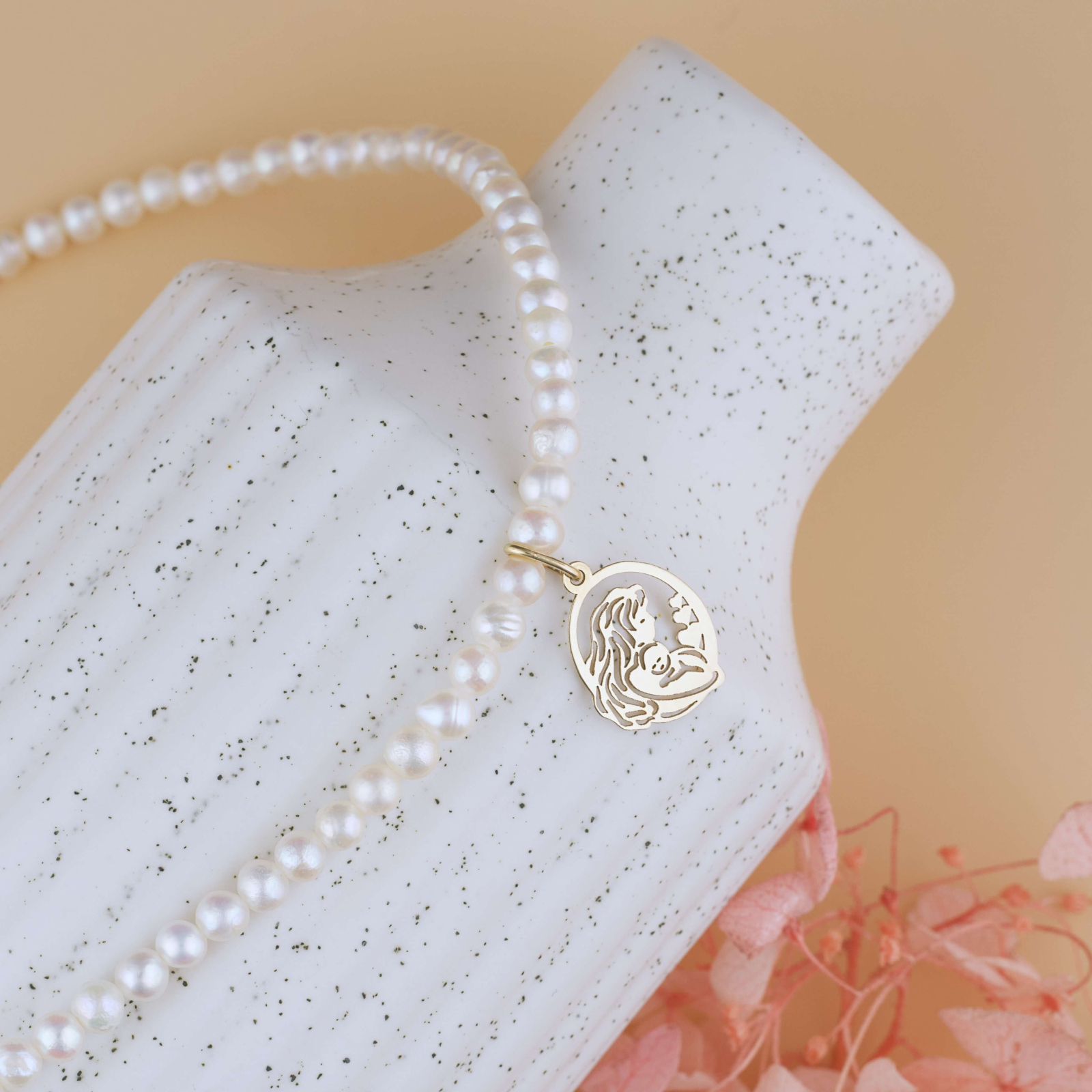 Colier delicat realizat din perle naturale de cultura, completat de un pandantiv din Aur 14K Mama & Bebe – o bijuterie cu o incarcatura emotionala profunda, ce surprinde una dintre cele mai pure legaturi: iubirea dintre mama si copil.