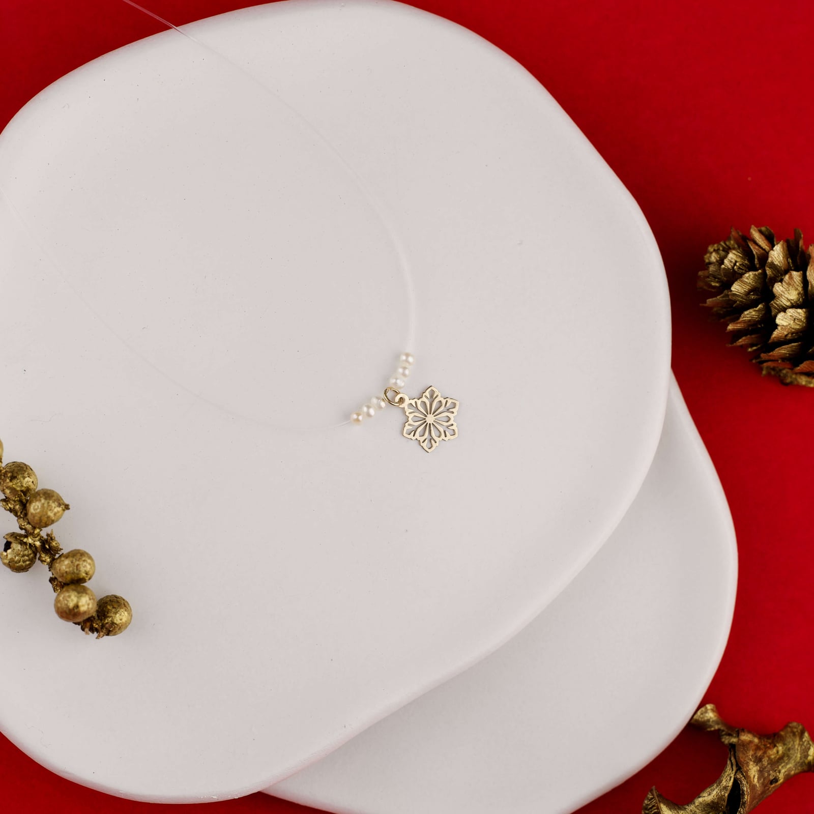 Accesoriu delicat, minimalist si stralucitor, creat special pentru sezonul sarbatorilor, lantisorul cu fir transparent de guta pune in valoare intr-un mod spectaculos pandantivul din Aur 14K in forma de fulg de nea, oferind un efect vizual de bijuterie care pluteste. Aspectul este elegant, modern si extrem de feminin – perfect pentru tinute de iarna, casual sau festive.