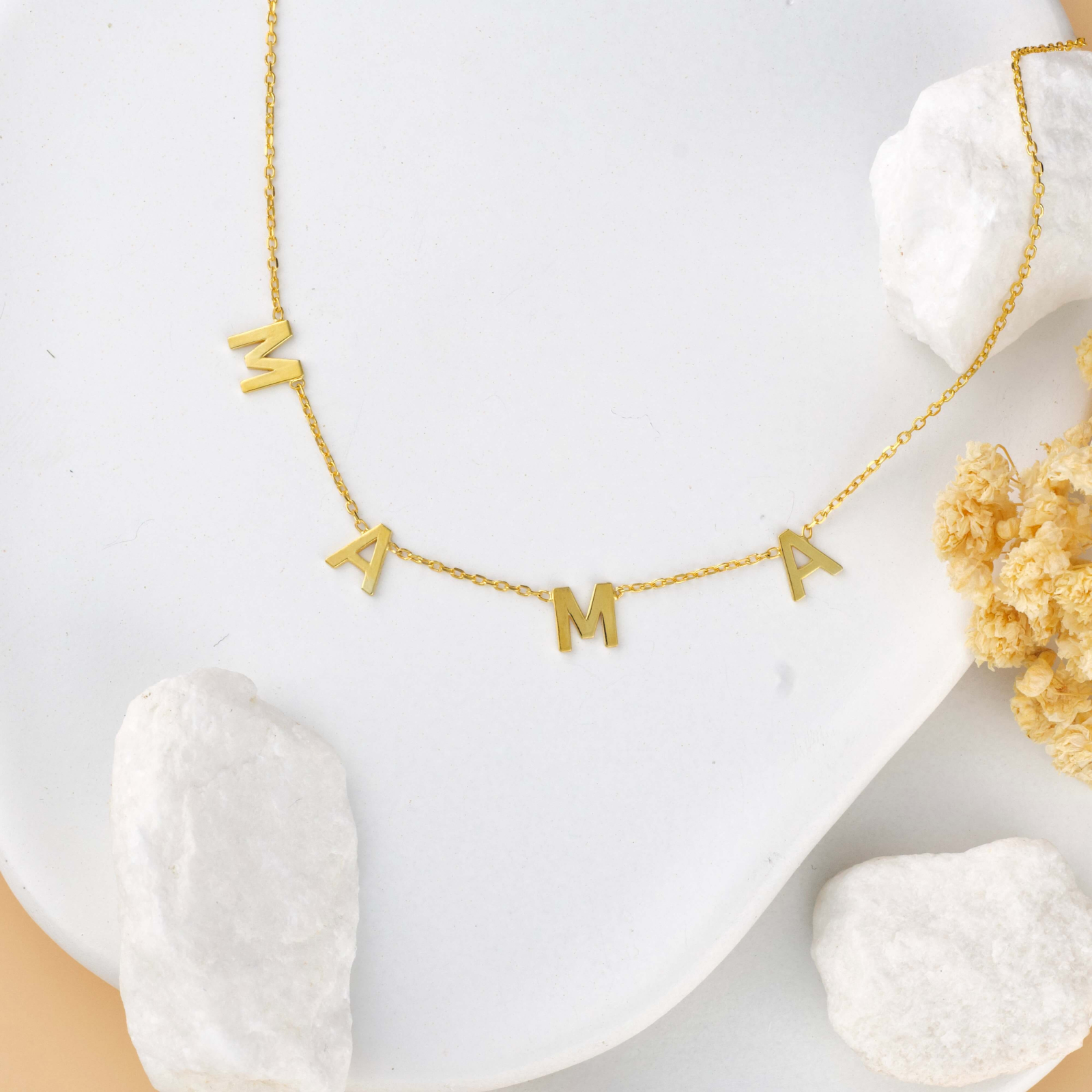 Acest lantisor elegant din Argint 925 placat cu Aur 18K este o bijuterie creata pentru a surprinde esenta calda si profunda a maternitatii. Designul cu literele M A M A dispuse individual pe lant, fiecare cu dimensiunea de 10 x 10 mm, transforma bijuteria intr-un mesaj purtat la vedere: recunostinta, iubire si legatura dintre mama si copil.