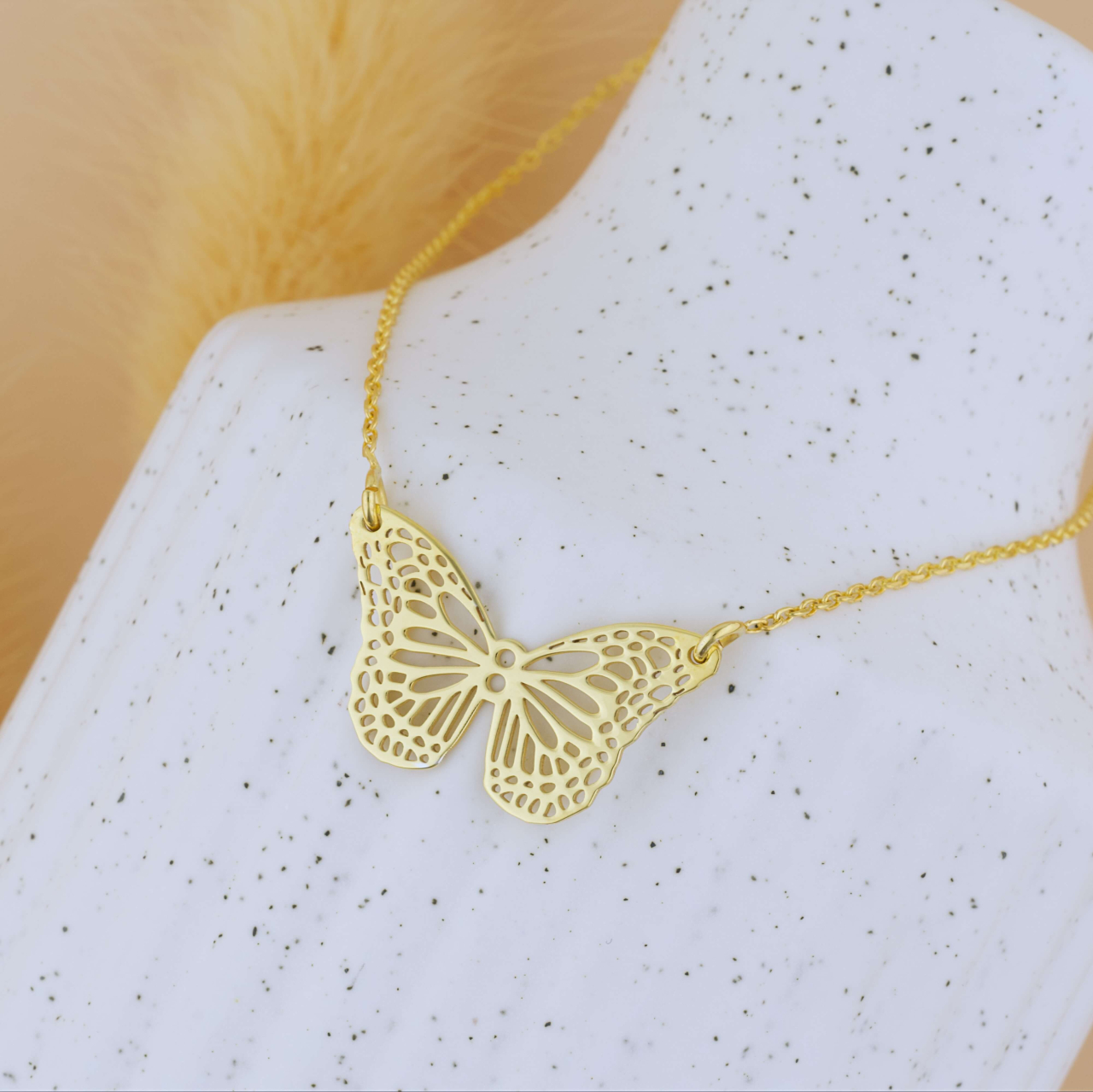 Lantisorul Fluture este genul de bijuterie pe care o porti si uiti ca o ai — pana cand cineva o observa si intreaba de unde e. Pandantivul reprezinta un fluture cu aripi deschise, lucrat in tehnica filigran decupat: fiecare nervura, fiecare golut dintre ele, este taiat cu precizie din argint 925, apoi acoperit cu un strat de aur 18K care ii da acea caldura aurie inconfundabila. Lantul subtire il tine la locul lui, centrat si luminos, exact acolo unde trebuie.