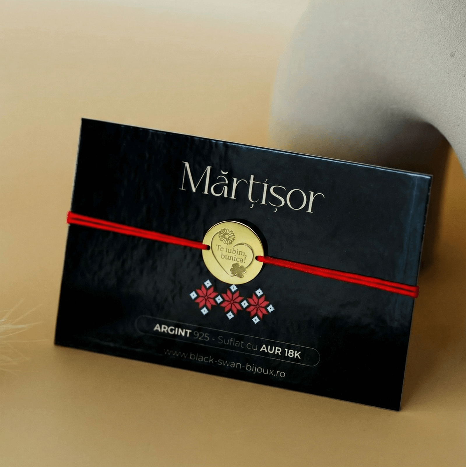 Realizata pe snur rosu traditional, bratara pastreaza semnificatia autentica a martisorului – protectie, noroc si inceputuri frumoase. Elementul central este un banut rotund din Argint 925 placat cu Aur 18K, pe care este gravat mesajul cald si emotionant “Te iubim bunica”.