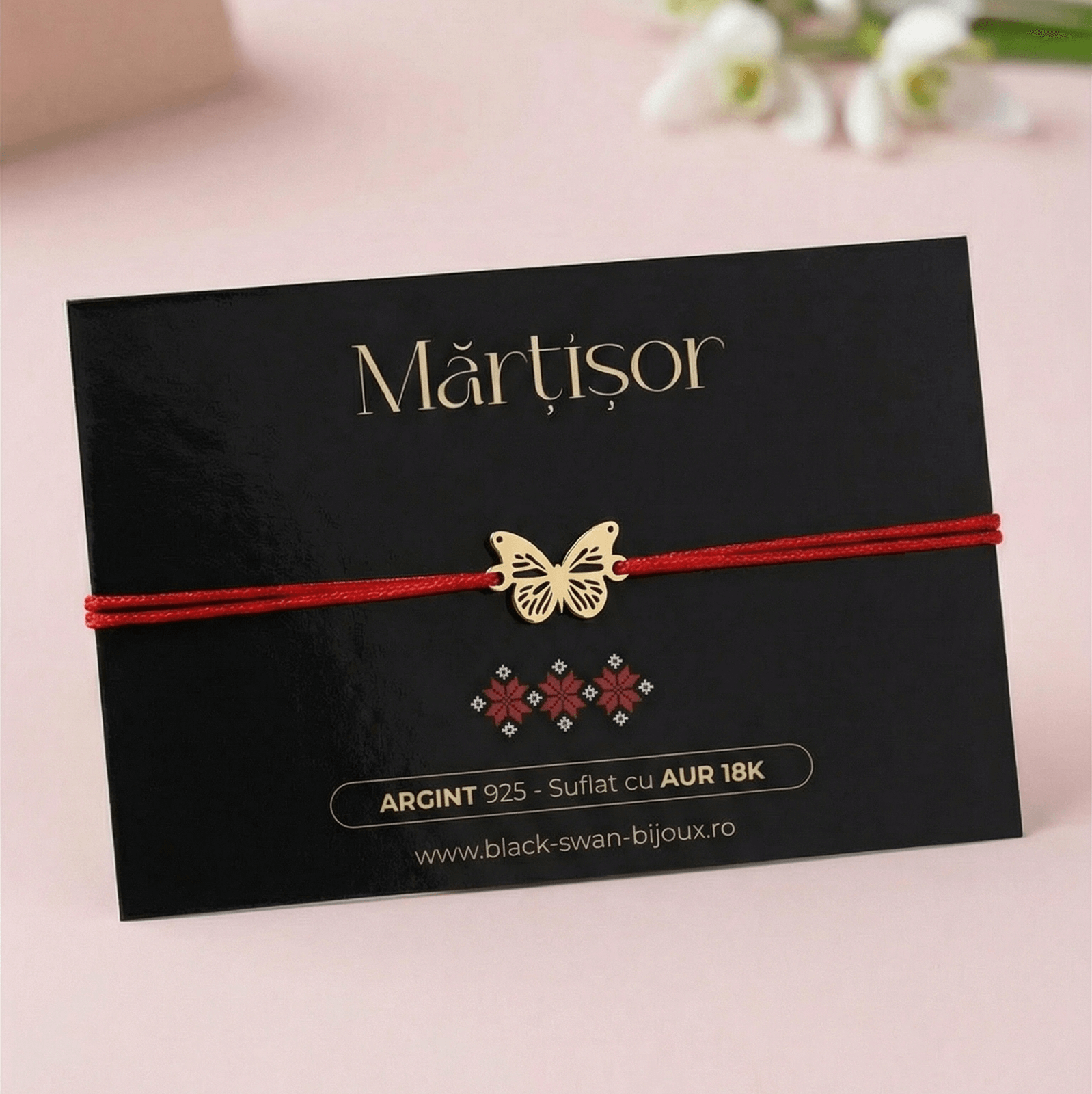 Acest martisor bratara cu snur, decorat cu un fluturas din Argint 925 suflat cu Aur 18K, simbolizeaza renasterea, transformarea si bucuria primaverii. Fluturasul este unul dintre cele mai indragite simboluri ale martisorului, reprezentand inceputurile frumoase, speranta si energia pozitiva aduse odata cu venirea noului sezon.