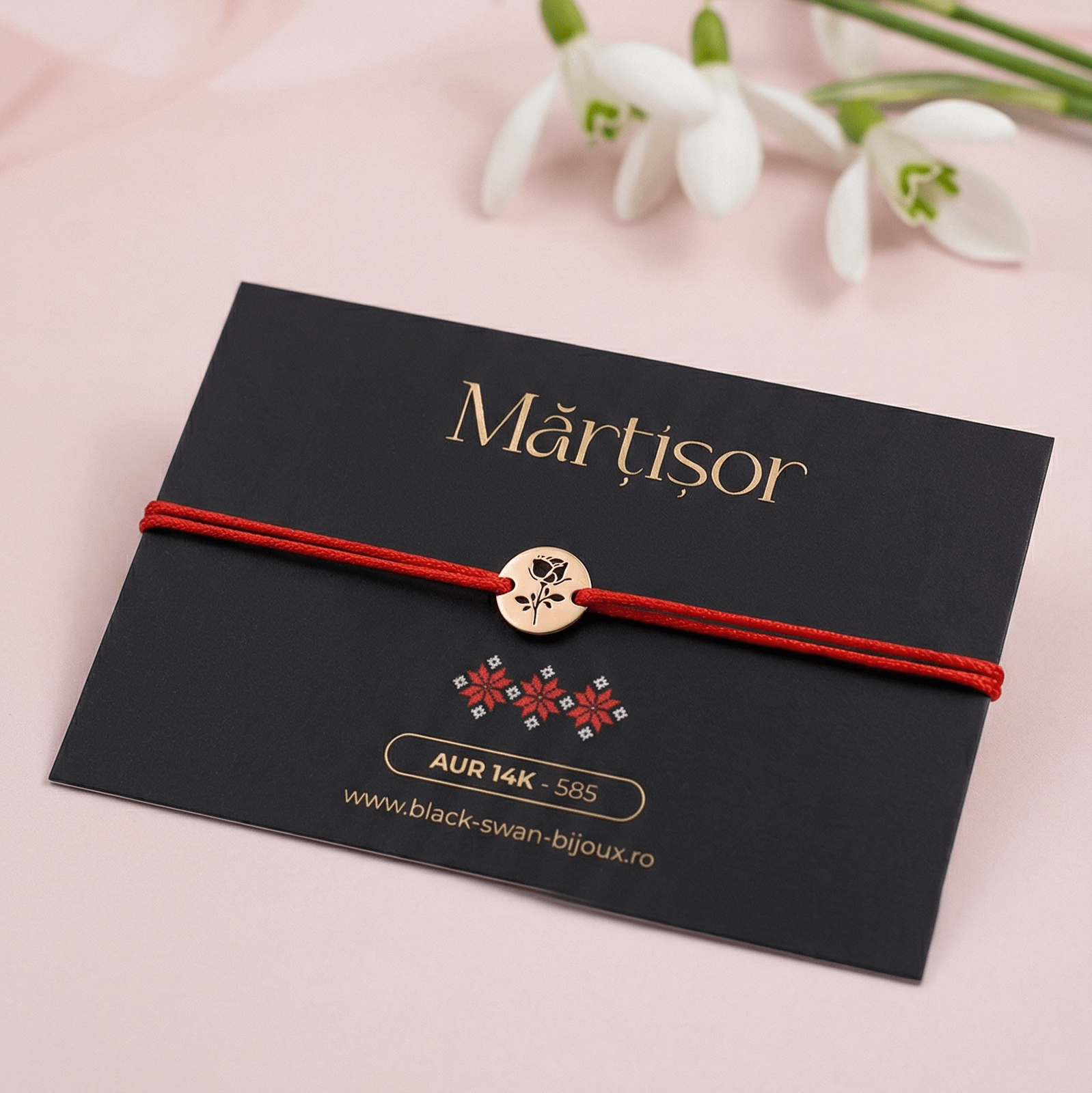 Acest mărțișor rafinat, realizat din aur de 14K, are gravat un trandafir – simbol al eleganței, pasiunii și grației. Fiecare detaliu al bănuțului este lucrat cu măiestrie, iar șnurul delicat îl transformă într-un accesoriu modern, ce poate fi purtat zi de zi, pentru a aduce noroc și a păstra vie amintirea celor dragi.