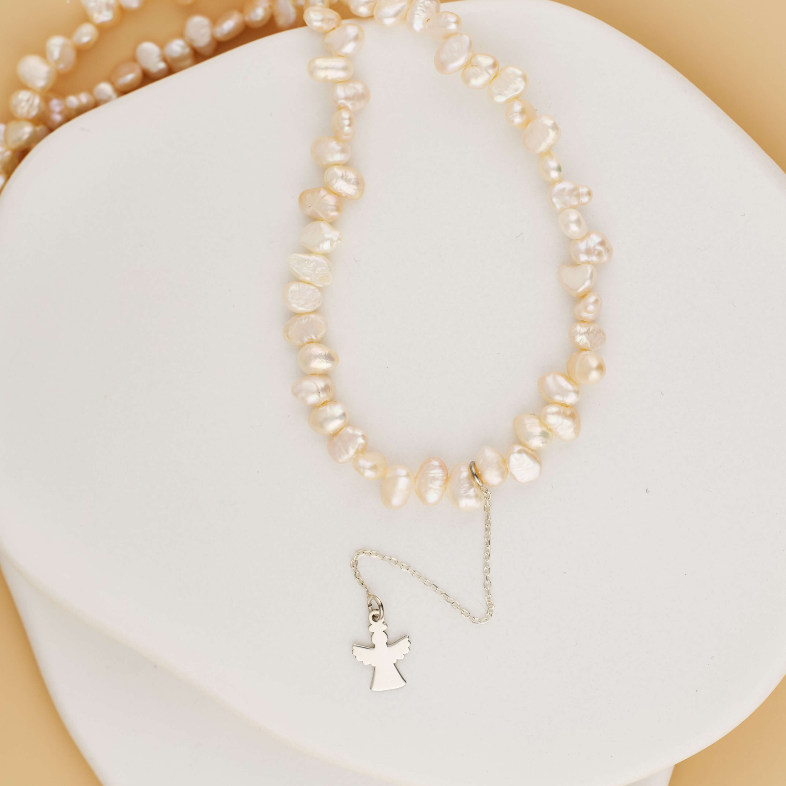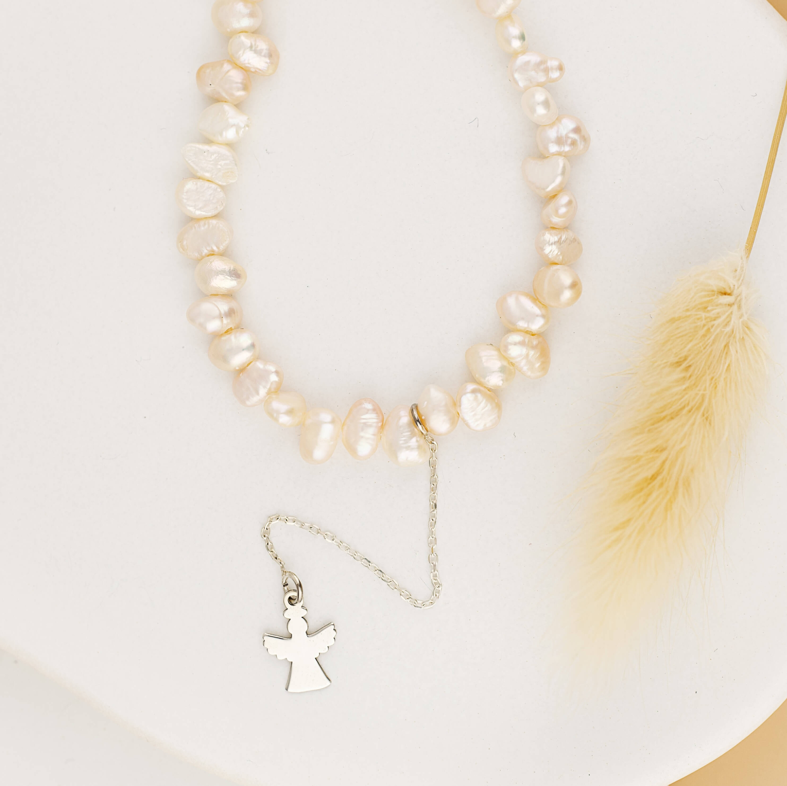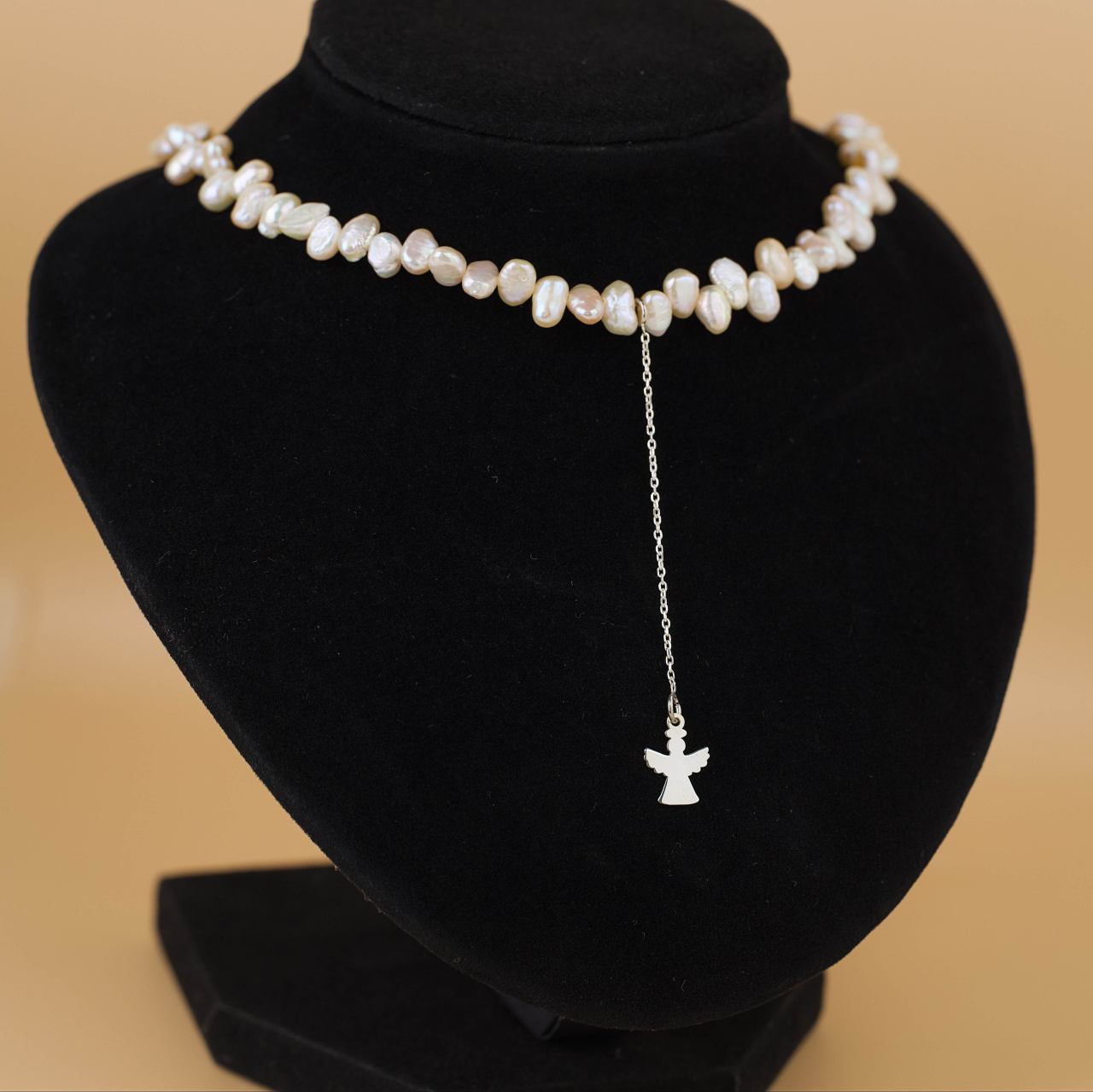 Colierul cu perle de cultura neuniforme si pandantiv Ingeras din Argint 925 imbina eleganta naturala a perlelor cu simbolul protectiei si al puritatii.